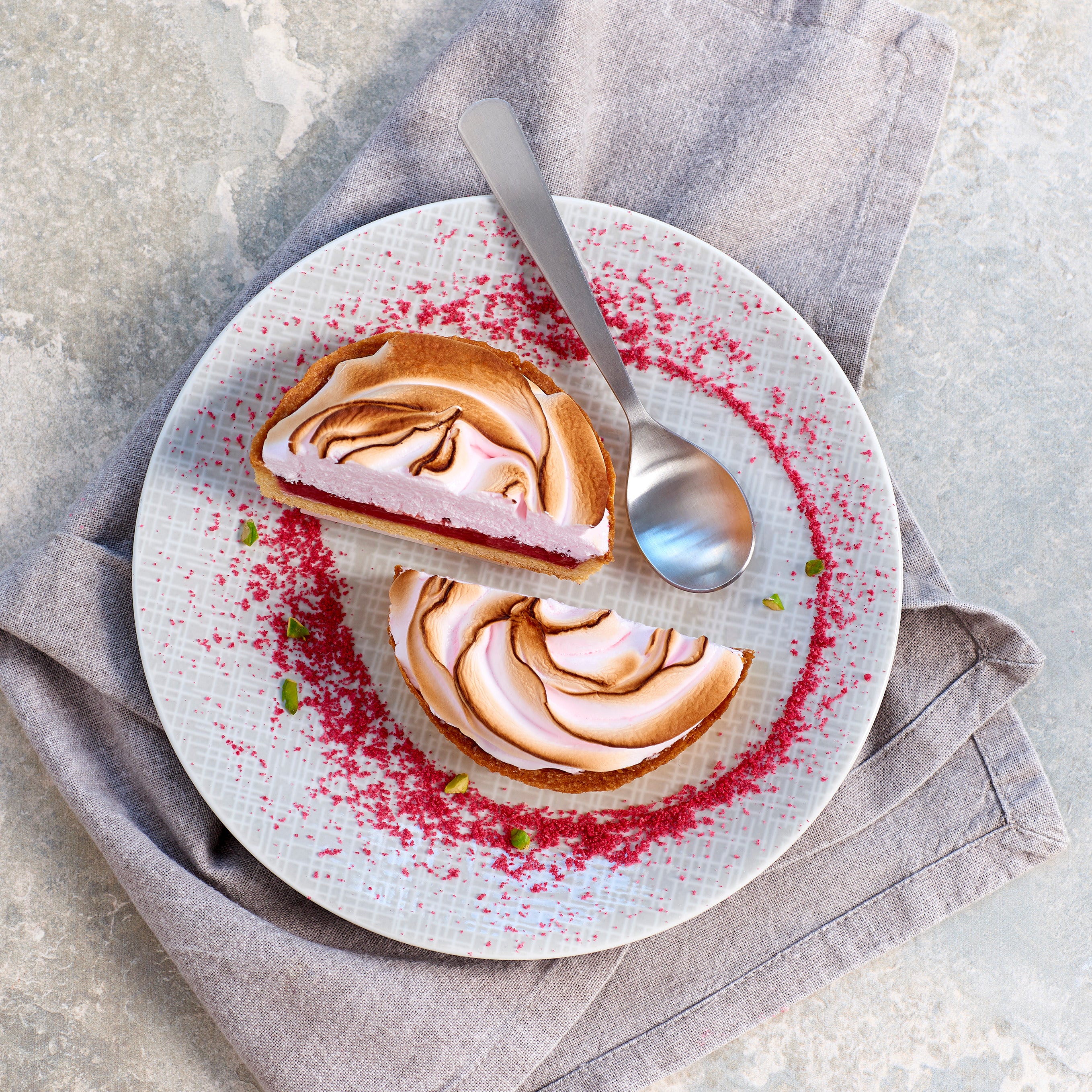 A delicate shortcrust pastry tart, filled with a delicate raspberry cream and a slightly pink meringue on top, which gives it a distinctive look and delicate taste. Made with butter and eggs from free-range hens, as well as raspberries.