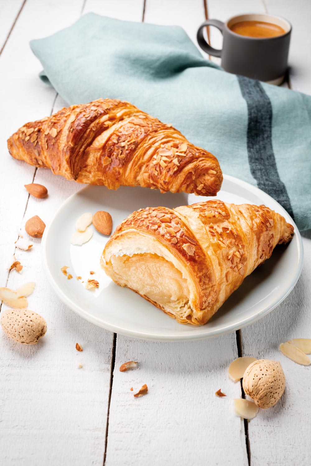 Ароматен маслен кроасан с фин бадемов пълнеж – мека текстура, златиста коричка и наситен орехов аромат. Създаден специално за любителите на класиката с гурме привкус, този кроасан комбинира 18% масло в тестото и богат пълнеж с бадеми за истинско удоволствие.