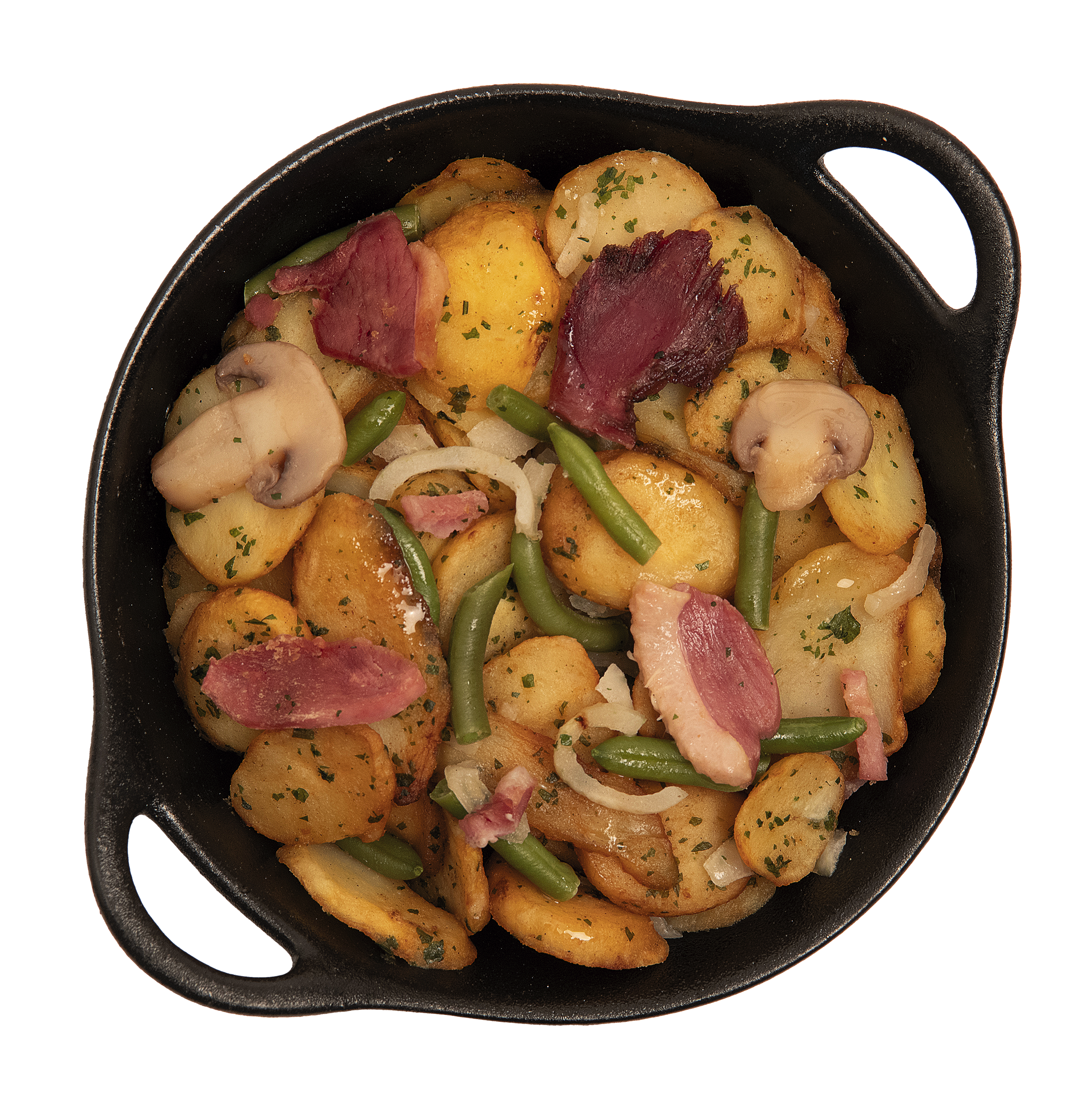Предварително пържени картофени резени 50% (картофи с произход ЕС 95,5%, слънчогледово олио, декстроза); зелен фасул 16%; тънко нарязани печурки 7%; осолени патешки воденички конфи 6% (патешки воденички, консервант: нитритна сол, пипер, патешка мас); термично обработен пушен бекон 6% (свински гърди, вода, сол, глюкозен сироп, натурални аромати, екстракти от подправки, антиоксидант: екстракт от розмарин, ферменти); лук; термично обработено патешко филе със кожа 2% (патешко филе, консервант: нитритна сол, декстроза, антиоксидант: аскорбинова киселина, натурален аромат на пипер); патешка мас; чесново пюре; магданоз; сол; чесън на прах; оризово нишесте; пипер.