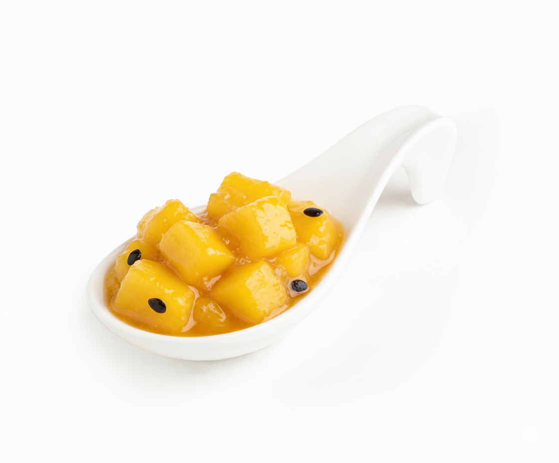 Пастьоризирана замразена заготовка от полуконфитирано манго на кубчета със стабилизиран сок и маракуя, под формата на Perles®. Интензивен плодов вкус, балансирана сладост и свежа киселинност, с характерни семенца от маракуя. Подходящ продукт за сладкарство, десерти, сладолед, пълнежи и модерна гастрономия.